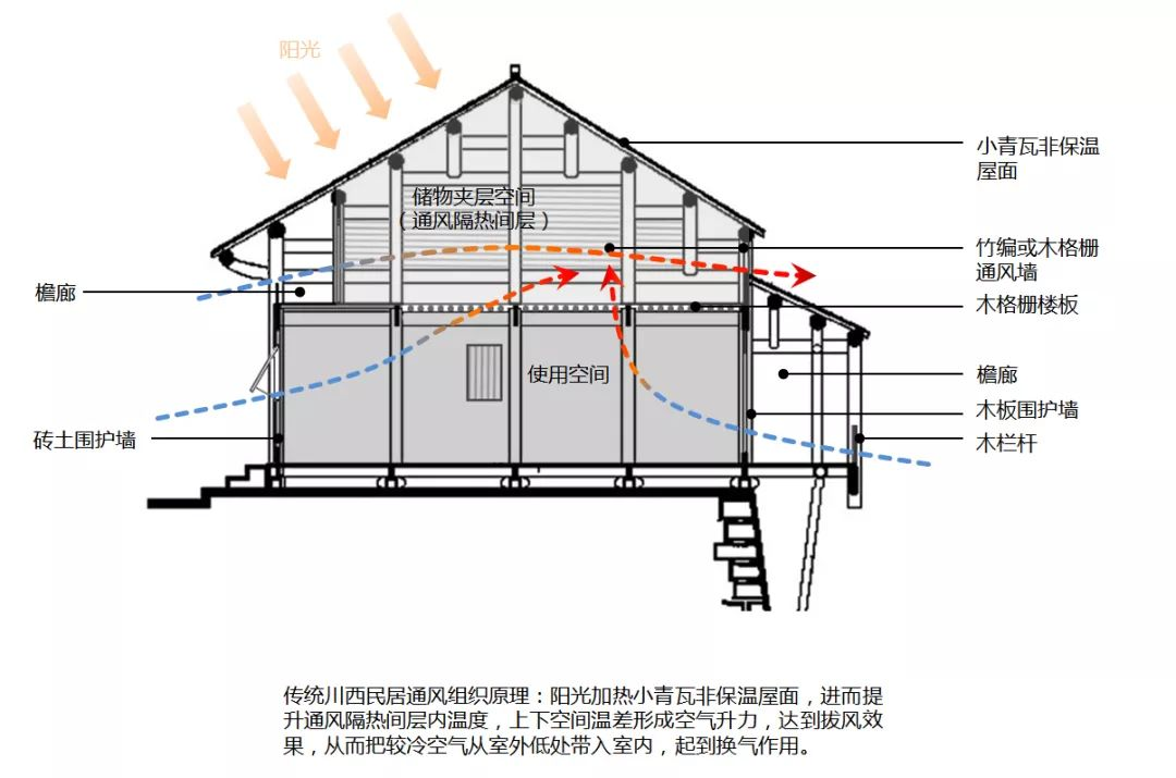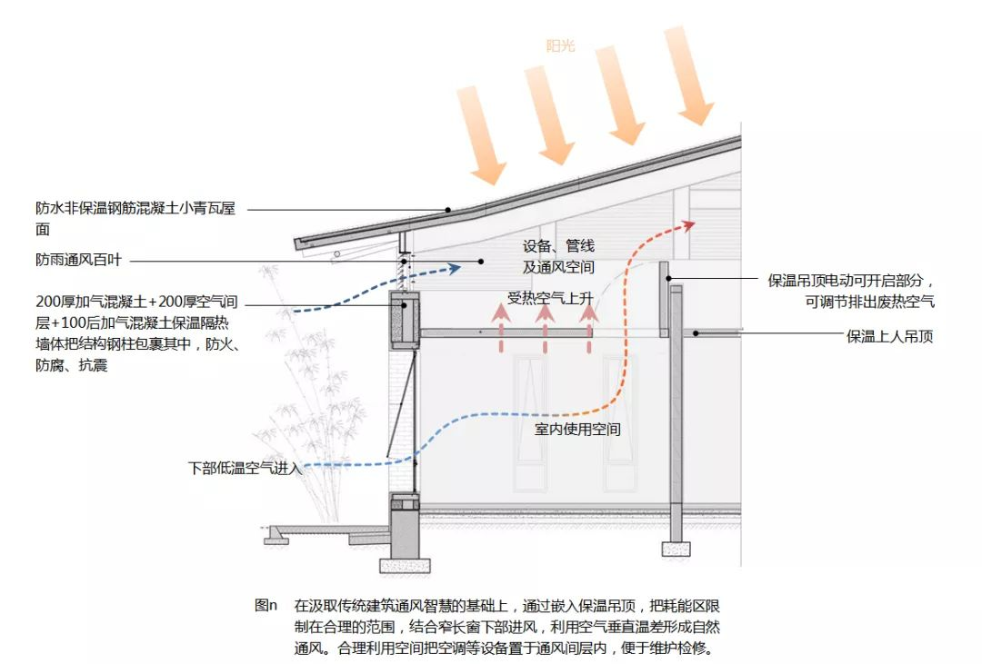 川西传统民居坡屋顶下、居住空间之上是通风的储物空间,其大部分时间改善舒适度的调节作用明显。新建筑单体的形式承袭川西民居特点采用坡屋顶,结合可开启(电动)的吊顶,地源热泵采暖等现代技术,使屋顶与保温吊顶间的空间起导风通风的组织及布置设备和管线之用,因此坡屋顶的坡度不再是传统民居的形式翻版,它以更缓的坡度取其神似。