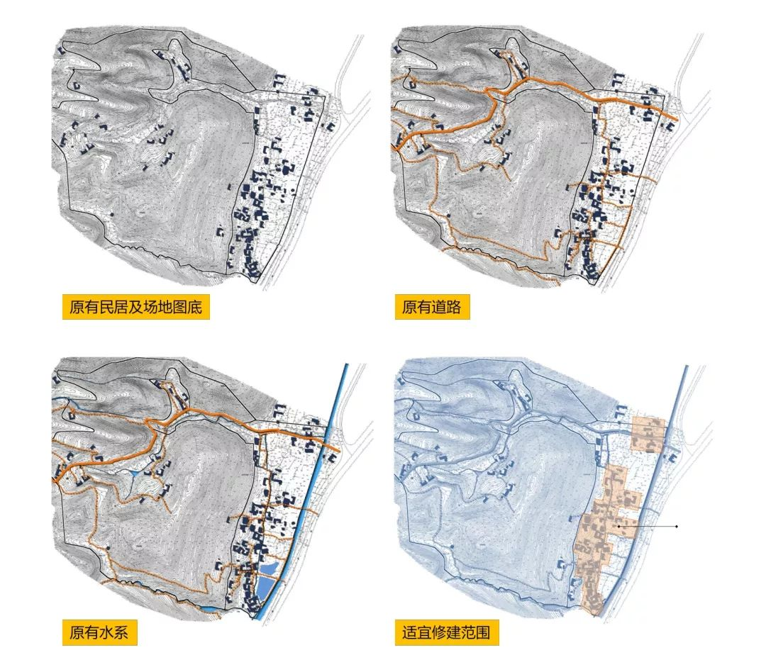 川西林盘基于传统对人与自然共生秩序的伦理因袭和“隐”逸“融”合的空间氛围,与项目设计无意作宏大的叙事,定位于还原建筑与环境朴素关系的逻辑基点不谋而合。通过研读林盘中建筑、院落、环境(植被)等元素之间的互为图底关系,引导形成面对诸多关系的处理策略。此为其“林盘”化格局。