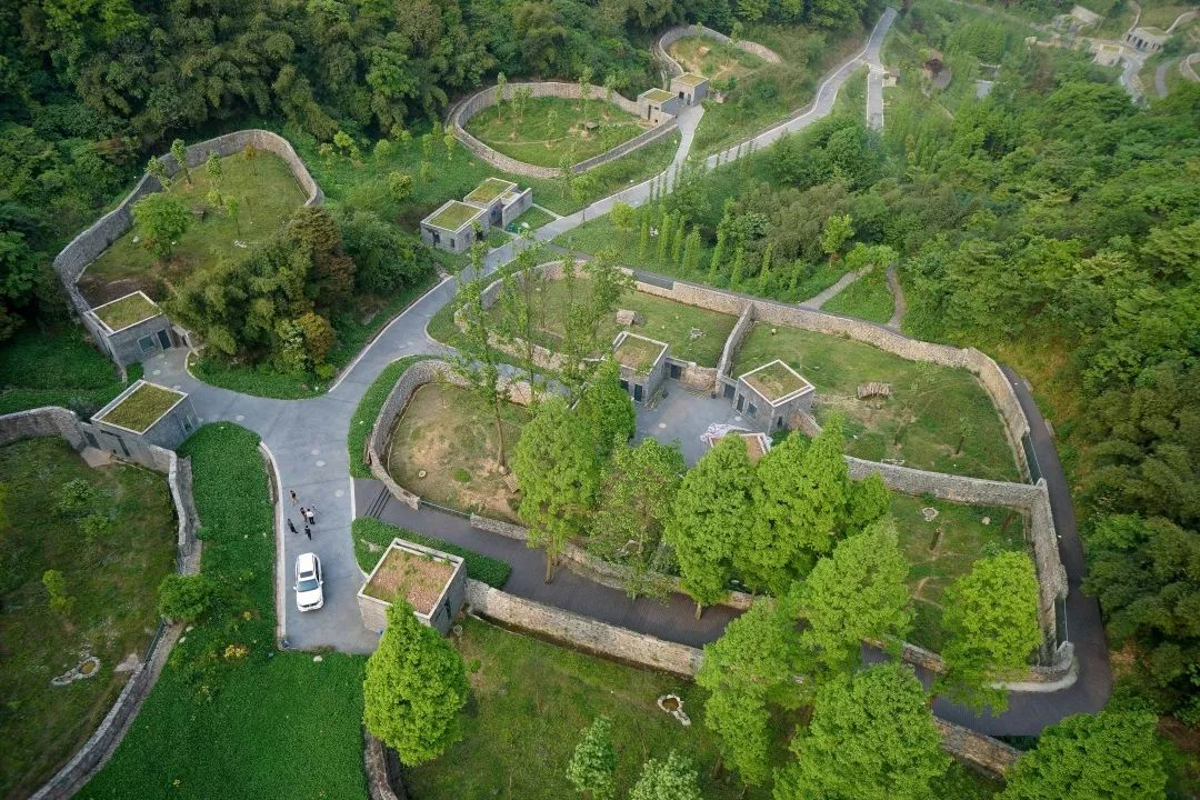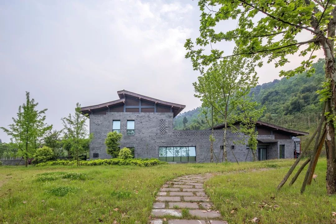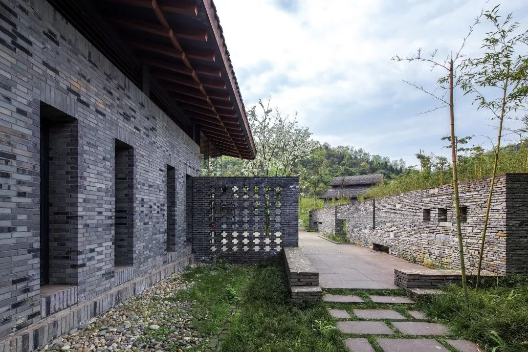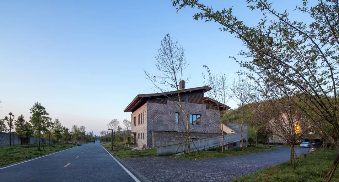 总体布局的聚落化,是对川西“林盘”智慧处理建筑与自然关系的直接“引用”,每幢或每组建筑的分解或构成都服从采光通风的基本节能原则,空间组织上形成“林盘”单元,“林盘”单元被置于原有民居宅基地范围内,并做减少土地承载力的收缩。最大限度地保持原有地势地貌不变,节约用地,还土地于自然。建筑与自然环境互为映衬,彼此消隐。