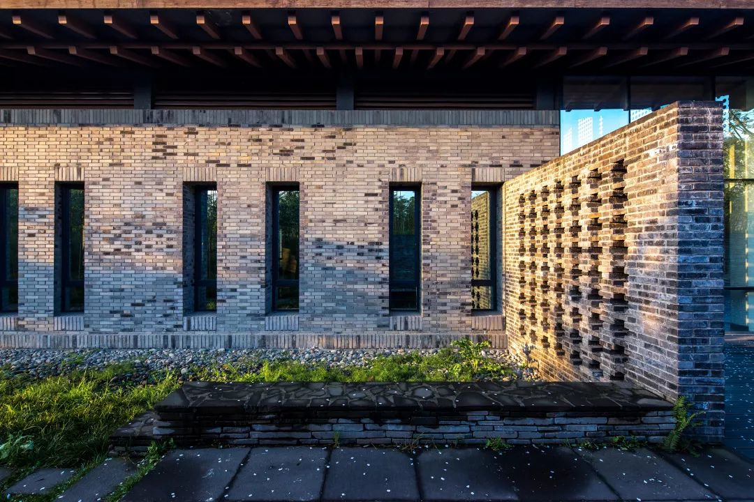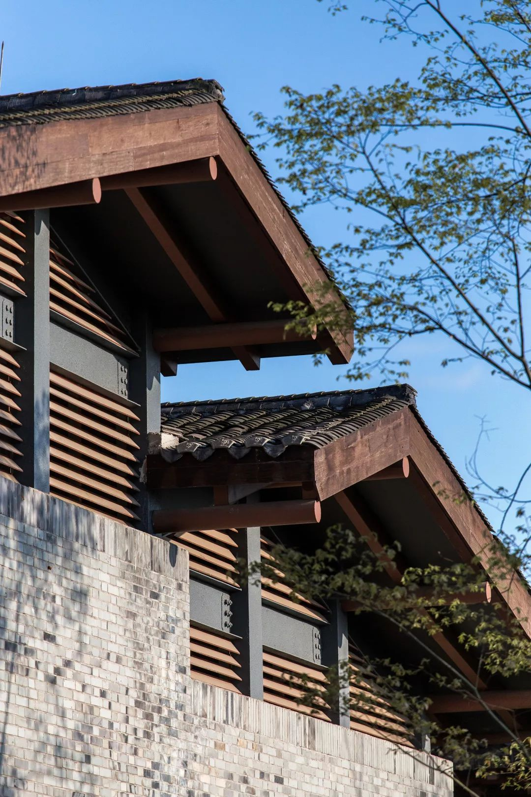 因建筑功能要求进深加大,建筑墙体的开窗选择了利于采光,同时满足通风的细高比例窗,并做成深凹窗洞的形式,结合深挑檐(具有导风作用)形成综合性外遮阳作用,采光节能兼得,形式上已不再是对传统民居的模仿,转而是在满足功能前提下,关注视觉物理功能(空间的对景)和审美体验的措施。