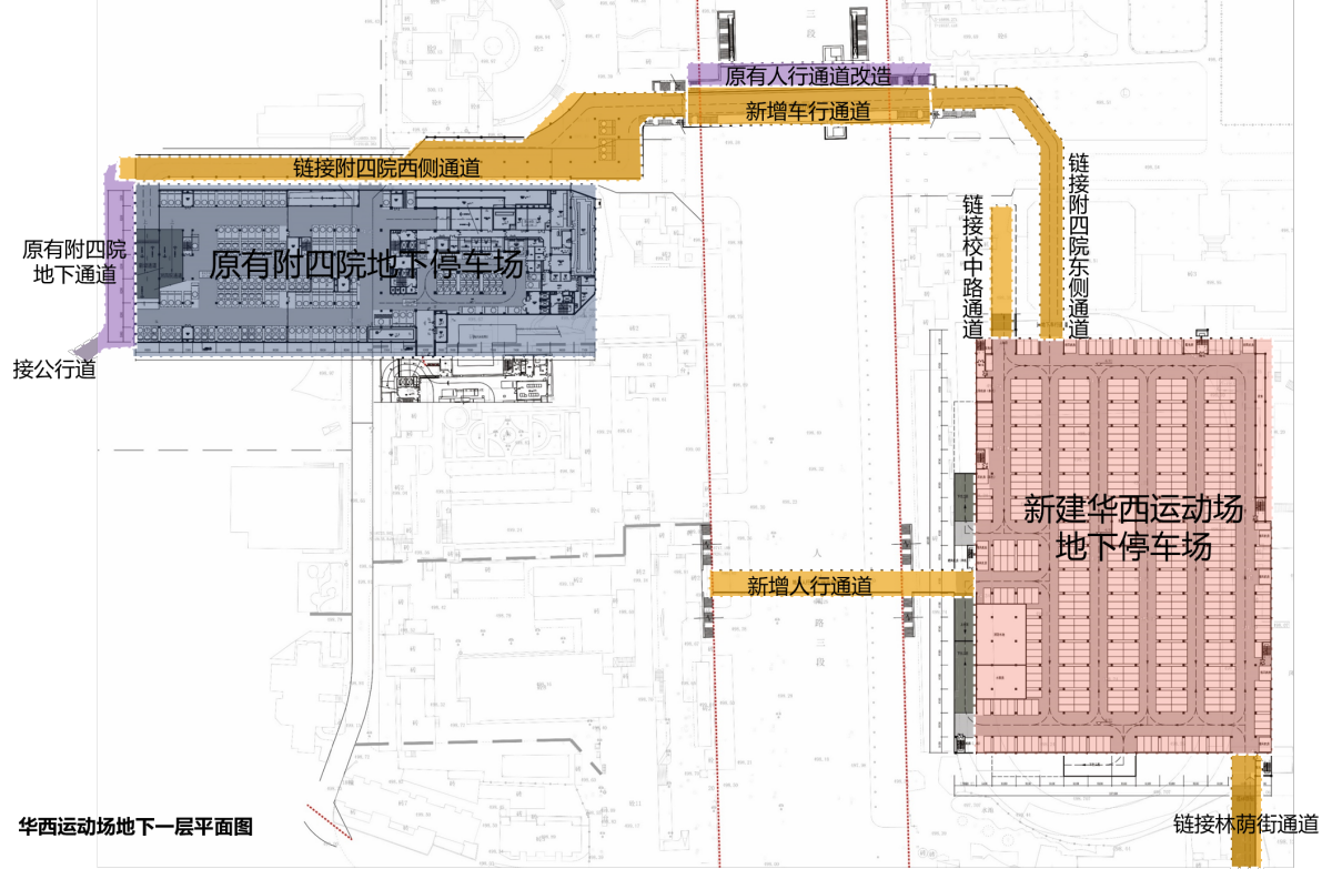 融入TOD理念的城市交通系统整合,通过分析片区周边现有城市地下空间情况,新增了三条地下通道,两条各约400米长地下车行通道,分别蜿蜒穿越川大华西医学院东西两个校区接入城市主要市政道路的车道,其中北侧通道中段为原有人民南路过街地下人行通道,本次设计将其进行了改造,将机动车行道功能与原有人行功能融为一体。