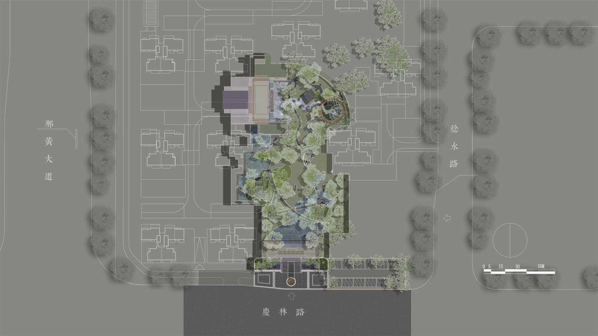 对于场地最大10.45的高差,我们尊重原始地形高差与水系布局,最大限度地利用及保护场地原生的古树与土地肌理,将湖、树、台、壁、亭、楼等自然生态资源融入环境之中,希望打造步移景异、一步一景的游园体验。