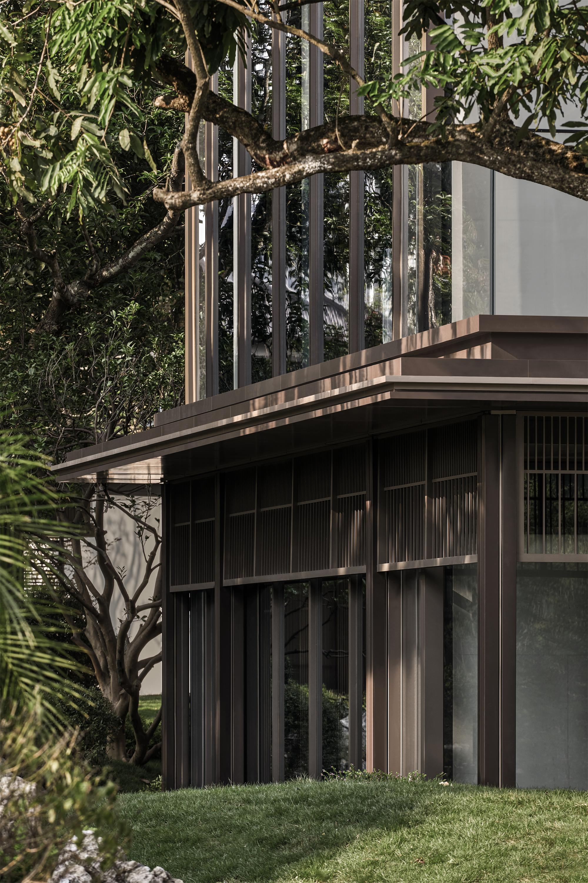 售楼处在保证整体风格典雅大气之外,对细部节点进行精心雕琢。在材质接口处采用巧妙的“隐形”手法,用格栅起翘等充满韵律感的设计来完善建筑细部。每个角度都体现着精细和价值感。