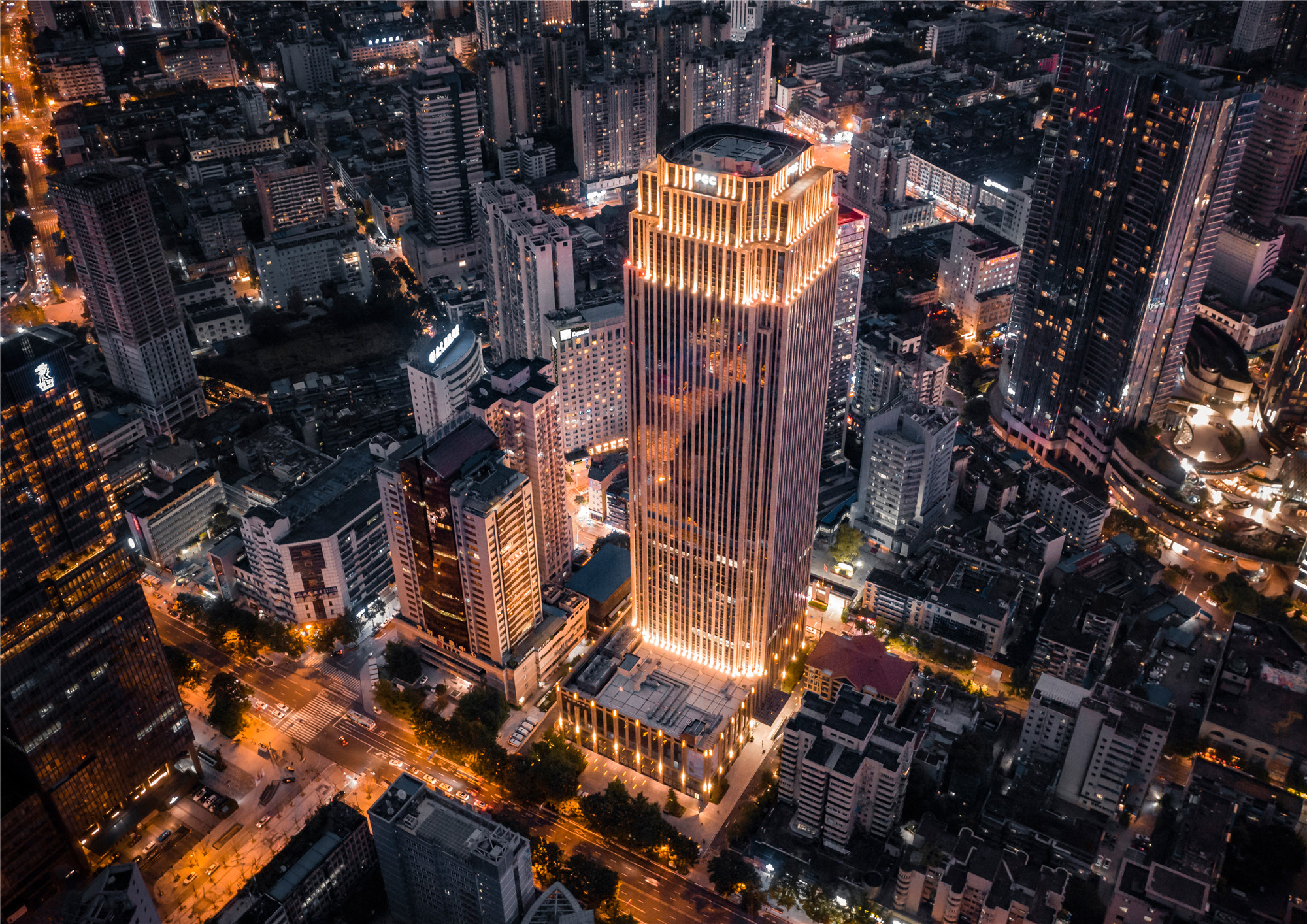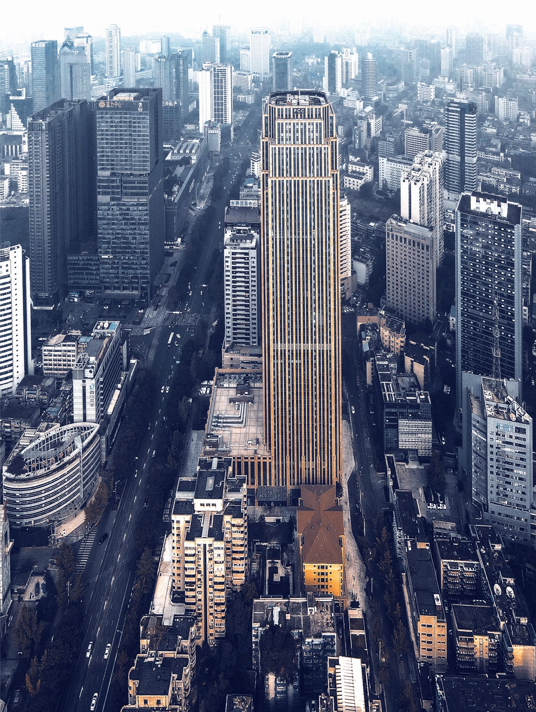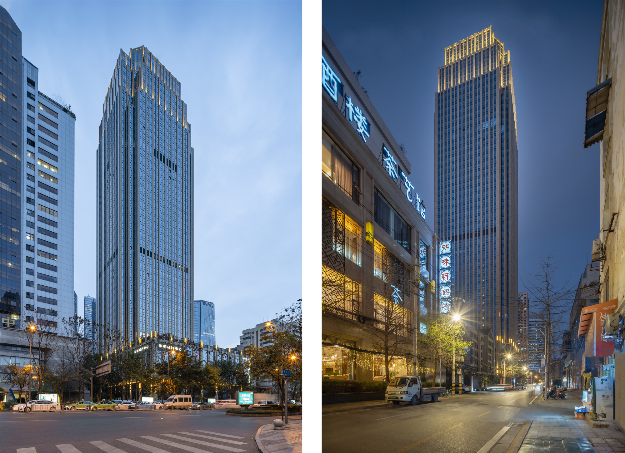 建筑在外立面材料的选择上打破玻璃盒子的束缚,采用玻璃和石材相结合的方式,运用竖向线条强调建筑的挺拔感,同时结合塔楼上部的分段收分,形成下部主体庄重,顶部典雅,整体简洁而兼具古典气质的地标形象,与周围具有历史年代感的城市背景完美融合。