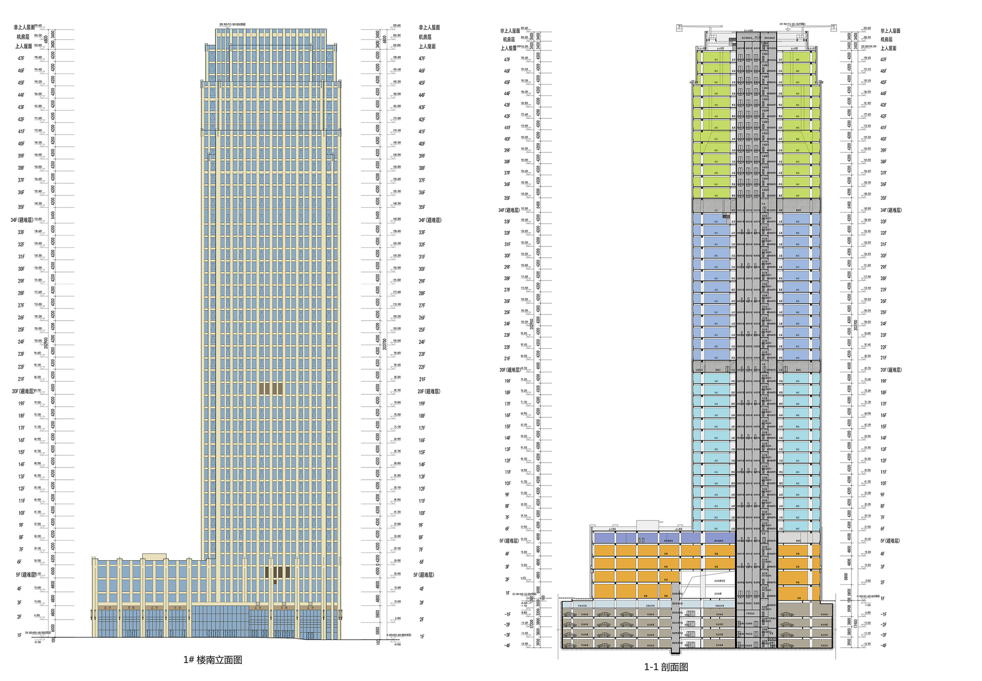 建筑从41层往上立面竖向收进,结构上局部采用了搭接柱形式。有效避免竖向构件不连续的同时避免了采用截面较大的转换梁。36~41层由于立面收退上下柱也不能对齐,且因内部功能限制不能设置搭接柱,本方案通过设置斜柱过渡,最大程度减少了柱截面尺寸对建筑功能的影响。