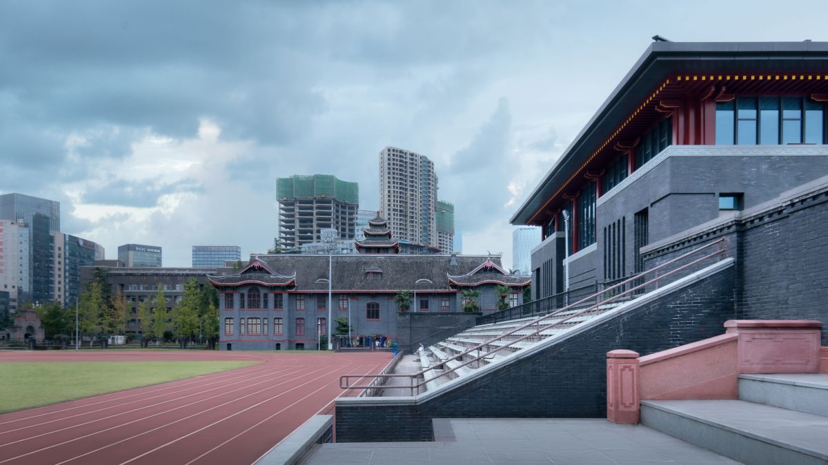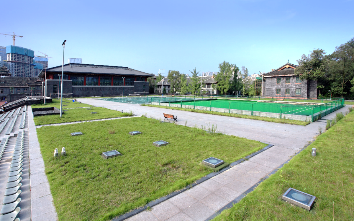 在此次停车场设计上,利用此次开挖和拆除看台的机会,将看台还建于球场东侧,以及新建地下网球馆。同时严格控制建筑风貌、高度和天际线的走向。在新建建筑与历史建筑群融为一个有机整体的同时,对历史建筑在人民南路一侧展示成都灿烂的历史文化底蕴,华西钟楼也通过开敞的城市空间成为人民南路上一道亮丽的风景。
