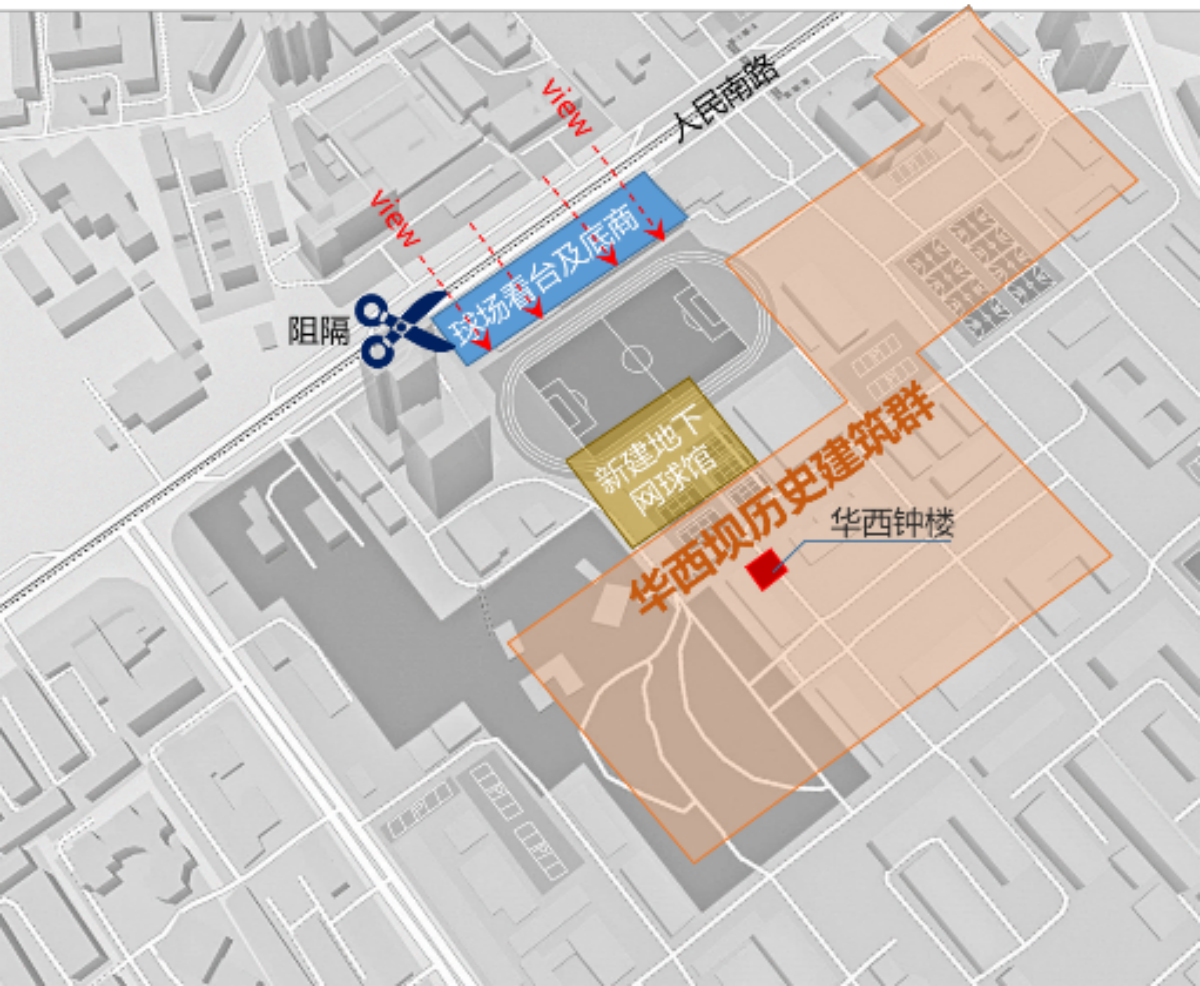 以华西标志性建筑钟楼为主的华西坝历史建筑群位于人民南路东侧,长期以来由于田径运动场看台的修建,遮挡住了历史建筑群在人民南路上的展示面。