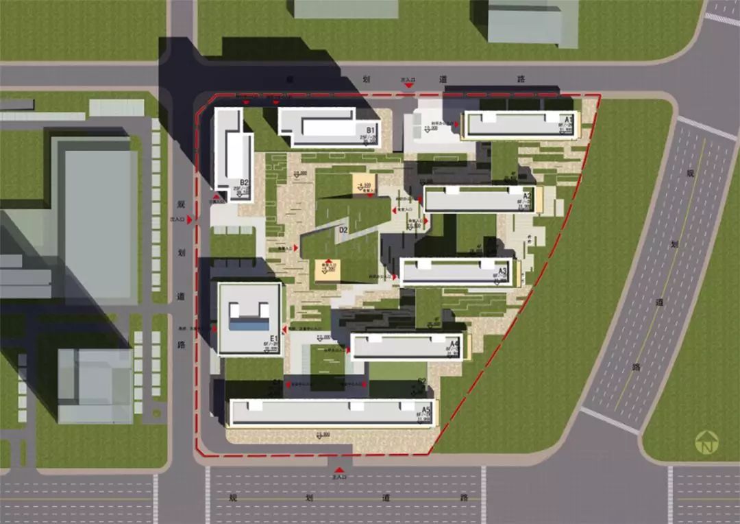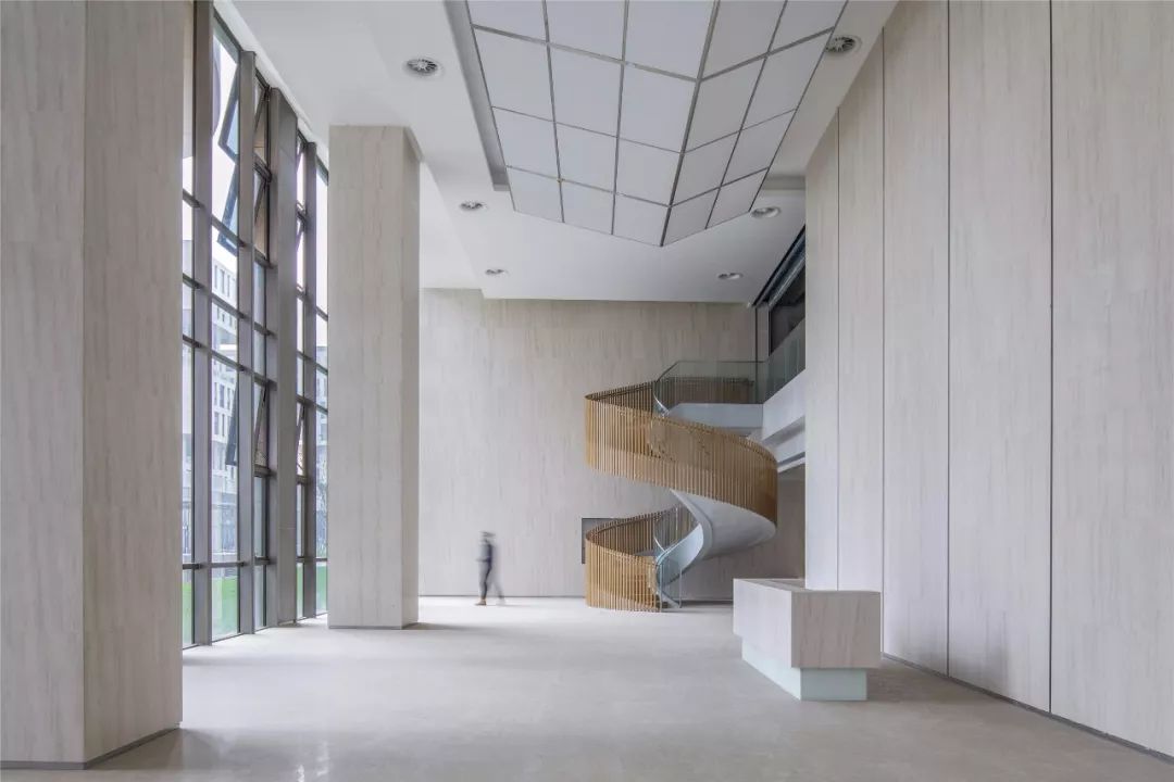 项目采用围合式布局,通过底层多处架空和建筑退让,实现园区内外空间、视线的对话,实现开放、融合的设计理念。
