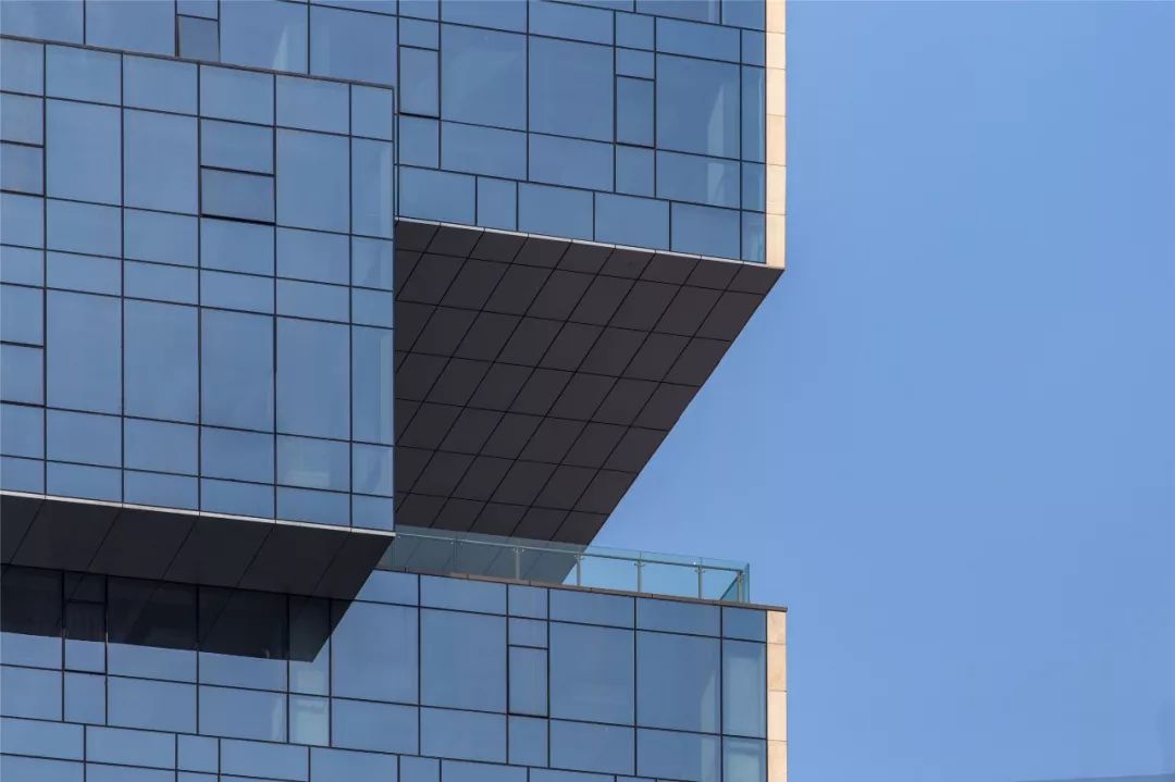 立面设计同分遵循气候的自然规律,西北角L形的办公塔楼,在东西向采用节能效果更好的更具韵律的洞口窗。